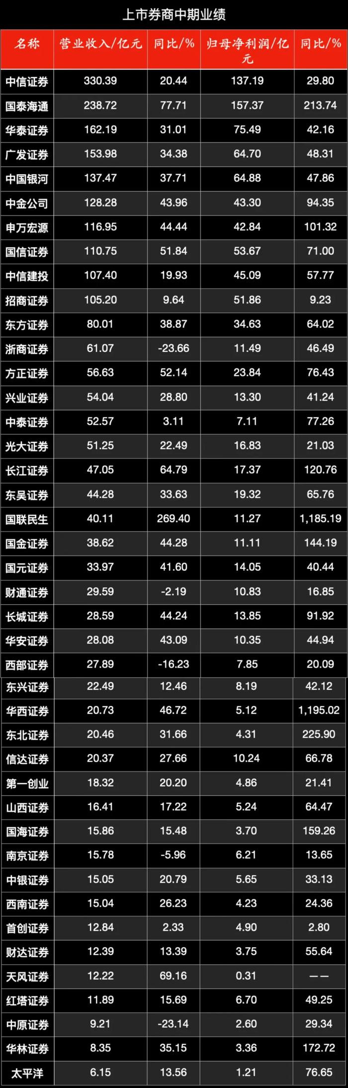 深入分析上半年业绩情况,在42家上市券商中,有37家券商的营业收入和归母净利润均实现了同比正增长,呈现出“双增长”的良好局面;中信证券、国泰海通、华泰证券、广发证券、中国银河、中金公司、申万宏源、国信证券、中信建投、招商证券等十大头部券商的营业收入全部超百亿元,中信证券、国泰海通两家公司的归母净利润均超百亿元。另外,还有1家上市券商成功扭转亏损局面,实现了归母净利润的扭亏为盈,基本面的修复为行业整体盈利水平提升注入了增量。